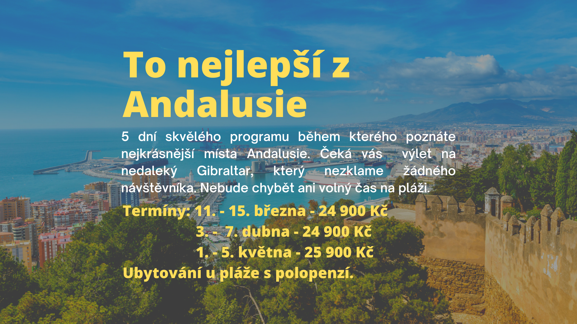Čeká vás několik dní na pobřeží Costa del Sol nedaleko Malagy, kde budete ubytování v krásném hotelu kousek od moře, takže po výletech si budete užívat pláž a moře. Výlety vás čekajií do historické Malagy, britské kolonie Gibraltar, monumentální Rondy a nádherného bílého městečka Mijas.