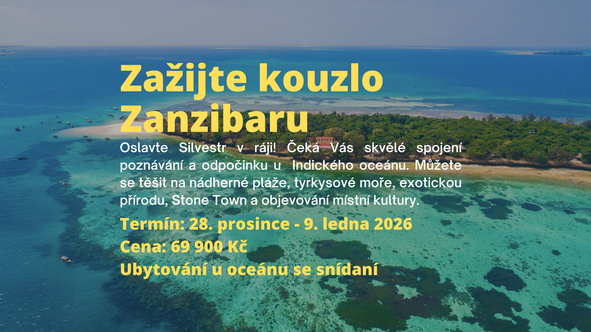 Čeká Vás nezapomenutelný příchod nového roku u východního pobřeží Afriky. Krásně teplý Indický oceán a bílé písečné pláže Zanzibaru jsou nezapomenutelným rájem pro turisty z celého světa. Toto prostředí je ideální jak k relaxaci, tak i poznávání místní kultury a života zdejších obyvatel.